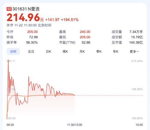 截至午间休市,壹连科技较发行价72.99元大涨194.51%报214.96元/股,市值140.36亿元;盘中最高触及240元/股,对应市值约156.71亿元。