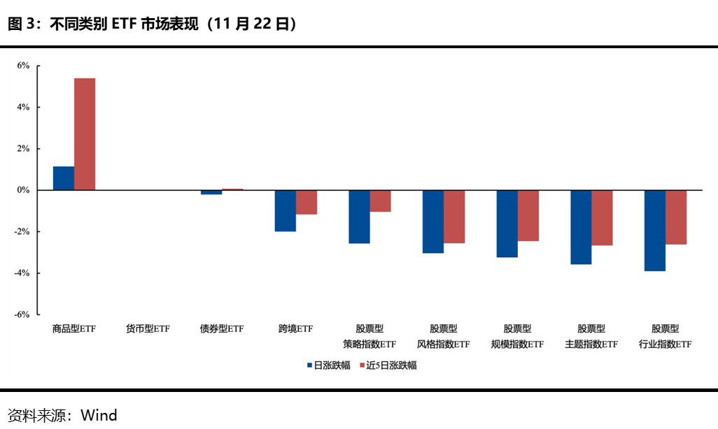 根据ETF基金的投资范围,将ETF基金划分为股票型规模指数ETF、股票型行业指数ETF、股票型策略指数ETF、股票型风格指数ETF、股票型主题指数ETF、债券型ETF、商品型ETF、货币型ETF、跨境ETF。今日商品型ETF表现最优,该类ETF的加权平均涨跌幅为1.15%;股票型行业指数ETF的表现最差,该类ETF的加权平均涨跌幅为-3.90%。