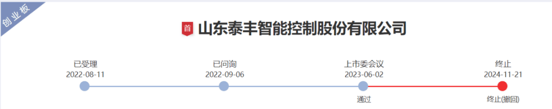 11月21日晚上,深交所公布对山东泰丰智能控制股份有限公司创业板IPO终止审核的决定,直接原因是公司及保荐机构第一创业证券撤回申报。公司IPO早在2023年6月2日获得审核通过,但一直未能提交注册。公司本次IPO拟募资5.5亿元。