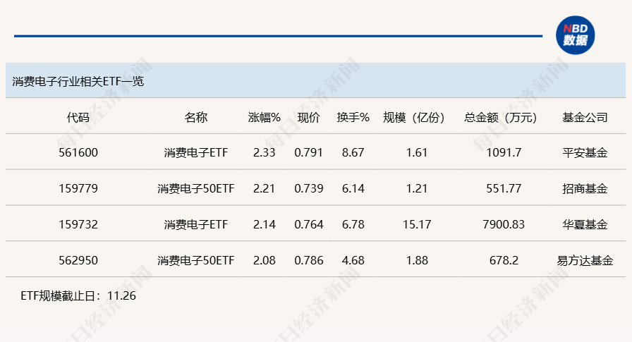 点评:消费电子ETF(561600)半日涨幅为2.33%,其规模为1.61亿份,半日成交金额为1092万元,该ETF追踪的是中证消费电子主题指数,追踪该指数的ETF还包括消费电子50ETF(159779)和消费电子50ETF(562950)。