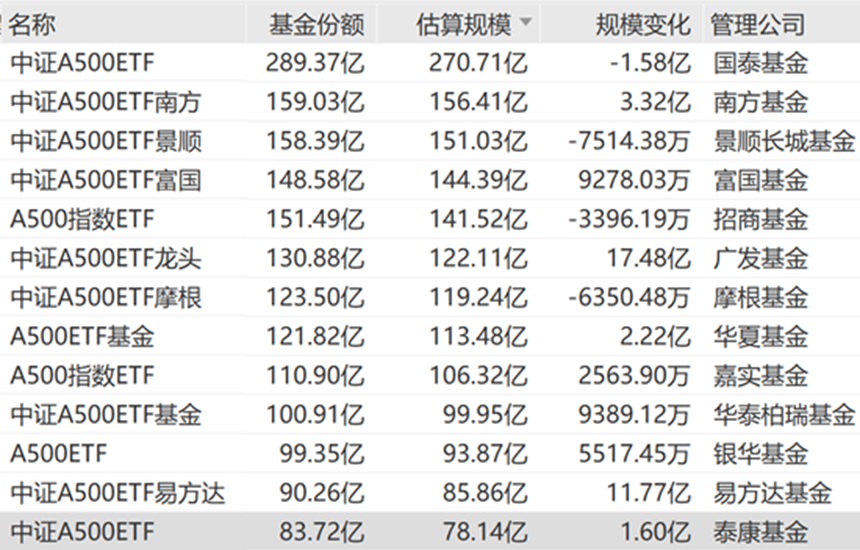 截至11月27日白天Wind披露的数据显示,各家基金中证A500ETF的估算规模已经拉开差距。