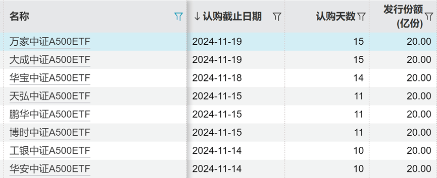 公告显示,包括万家中证A500ETF、大成中证A500ETF、华宝中证A500ETF、天弘中证A500ETF、鹏华中证A500ETF、博时中证A500ETF、工银中证A500ETF、华安中证A500ETF都处于募集结束,即将上市的状态。