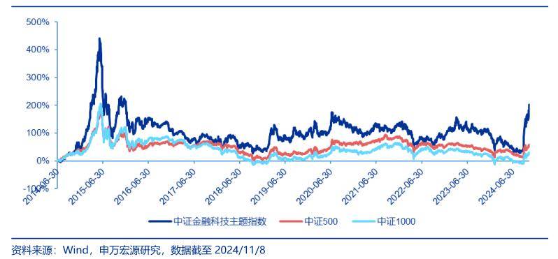来源:申万宏源研究,统计区间2014.6.30-2024.11.8。金融科技ETF被动跟踪中证金融科技主题指数,该指数基日为2014.6.30,发布日期为2017.6.22,中证金融科技主题指数2019-2023年年度涨跌幅分别为:48.18%、10.46%、7.16%、-21.40%、10.03%。指数成份股构成根据该指数编制规则适时调整,其回测历史业绩不预示指数未来表现。