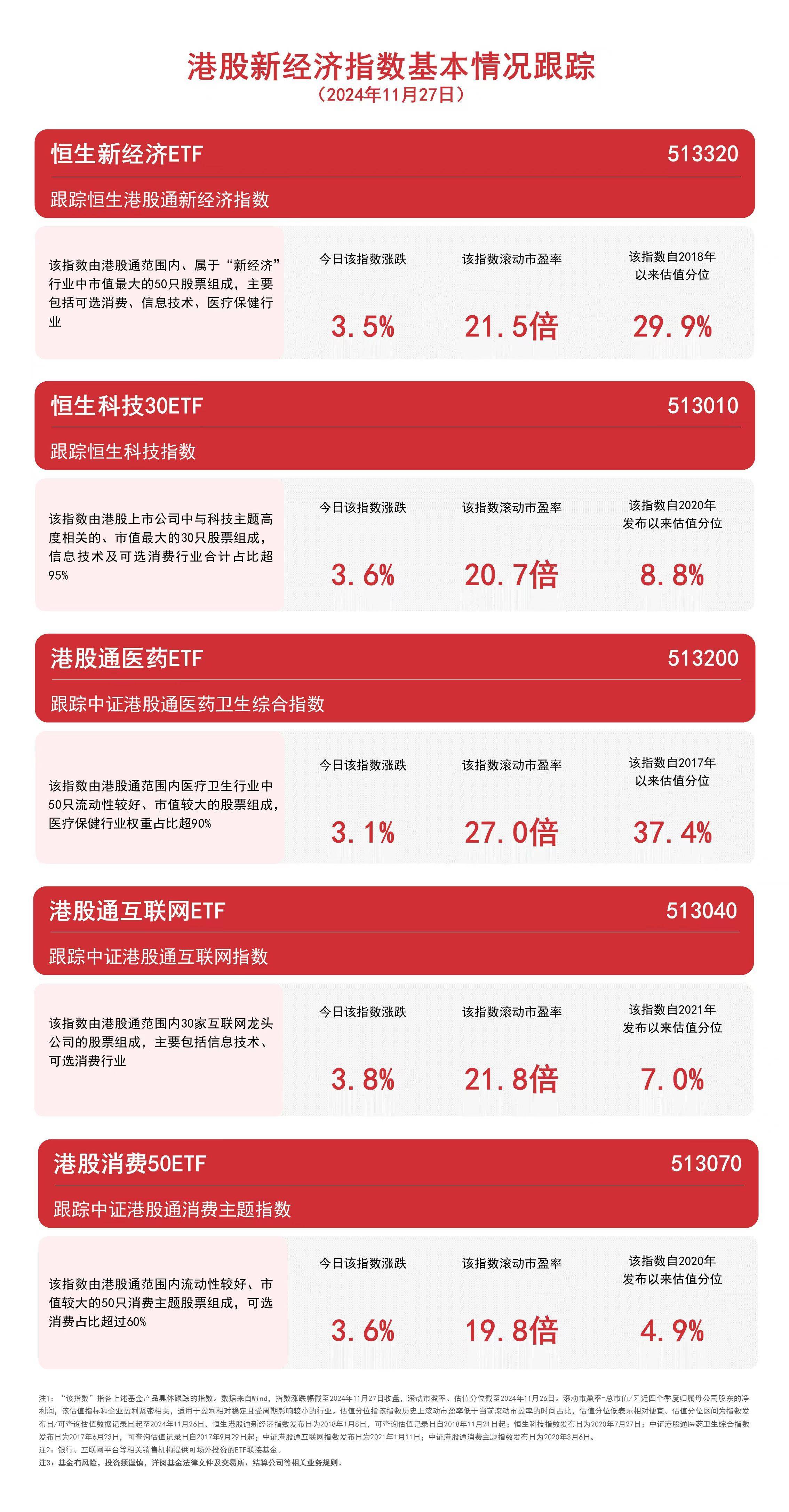 截至收盘,今日中证港股通互联网指数上涨3.8%,恒生科技指数上涨3.6%,中证港股通消费主题指数上涨3.6%,恒生港股通新经济指数上涨3.5%,中证港股通医药卫生综合指数上涨3.1%。