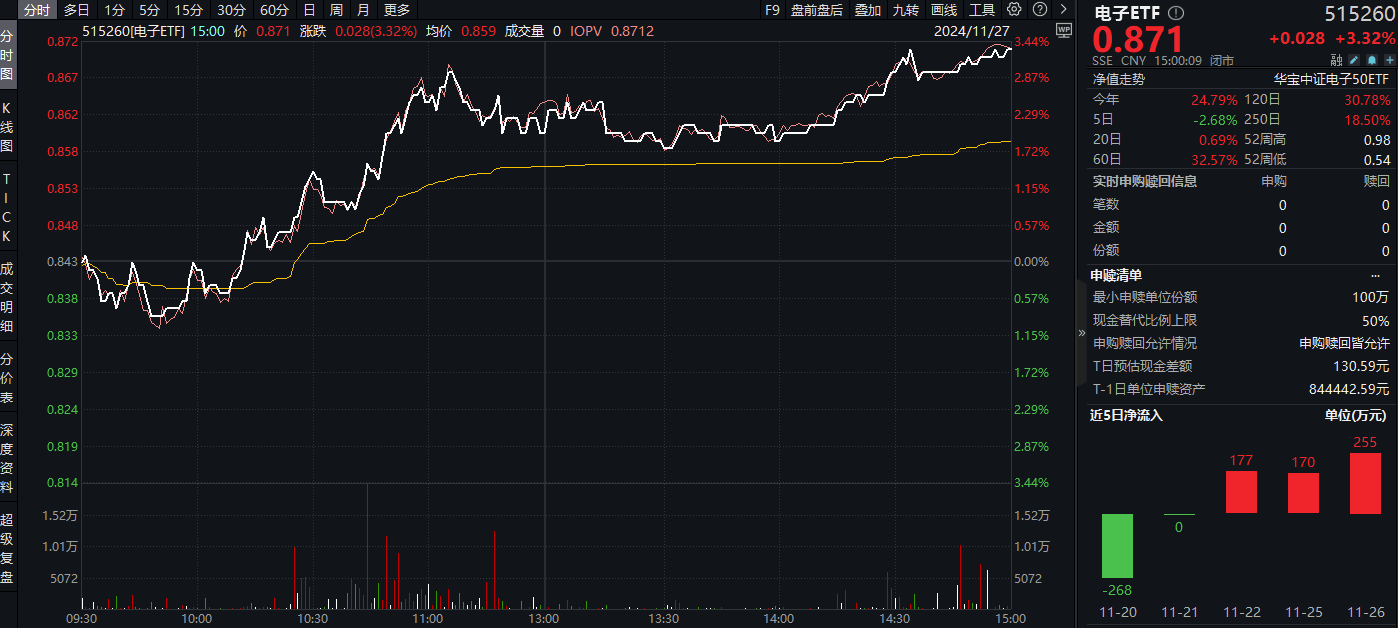 热门ETF方面,一基双拼“半导体+消费电子”的电子ETF(515260)迎着一波又一波的攻势不断上涨,截至收盘,场内价格猛拉3.32%,一举收复5日均线。