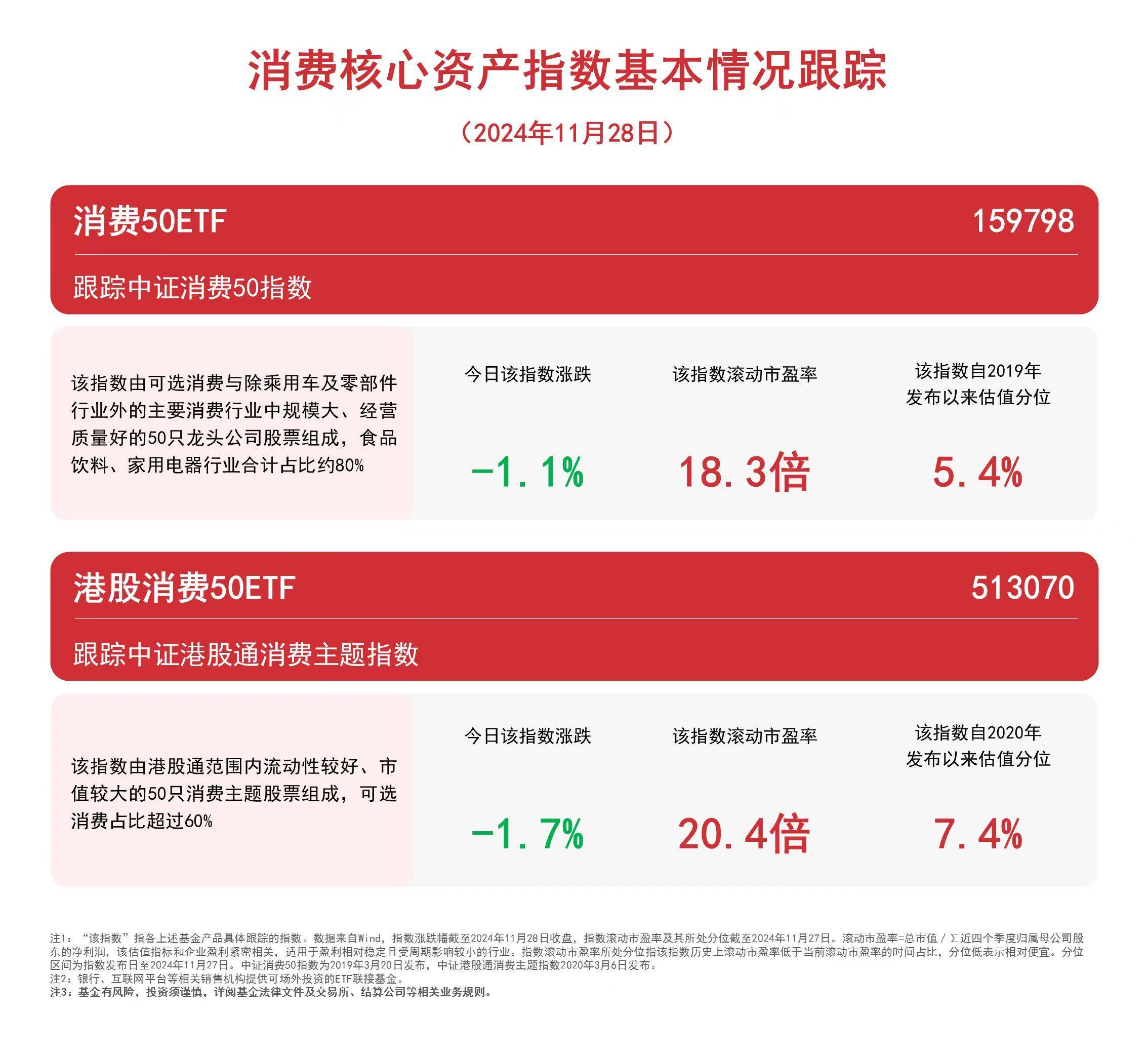 截至收盘,今日中证消费50指数下跌1.1%,中证港股通消费主题指数下跌1.7%。