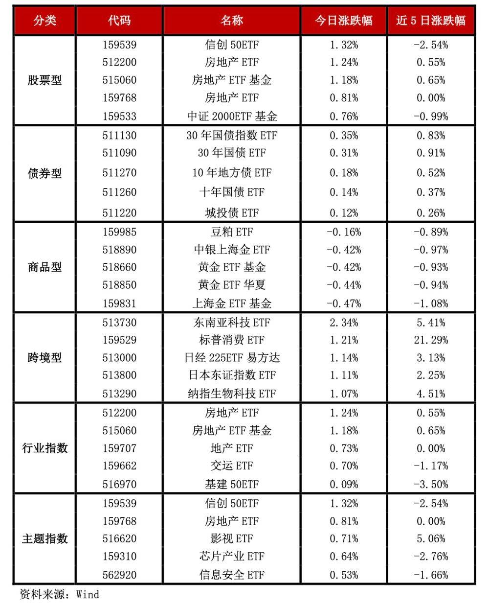 从不同投资种类、行业、主题的ETF产品中找出今日走势行情排名前5的ETF基金,根据Wind数据,今日表现优异的ETF产品如下表所示。股票型ETF中涨幅最高的3只ETF产品分别为信创50ETF(159539)、房地产ETF(512200)、房地产ETF基金(515060),今日收益率分别为1.32%、1.24%和1.18%。