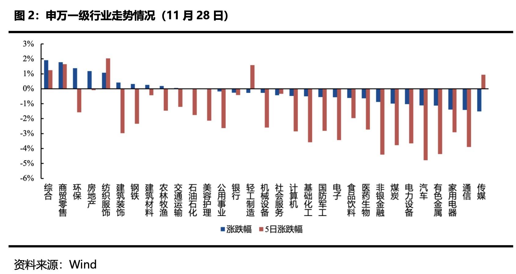 统计全部申万一级行业今日涨跌幅情况,综合、商贸零售、环保今日走势排名靠前,日涨跌幅分别为1.91%、1.78%和1.38%;家用电器、通信、传媒的走势排名靠后,日涨跌幅分别是-1.39%、-1.42%和-1.52%。近5个交易日纺织服饰、商贸零售、轻工制造的走势排名靠前,近5日涨跌幅分别为2.04%、1.65%和1.59%;有色金属、非银金融、汽车行业的走势排名靠后,近5日涨跌幅分别为-4.37%、-4.41%和-4.78%。
