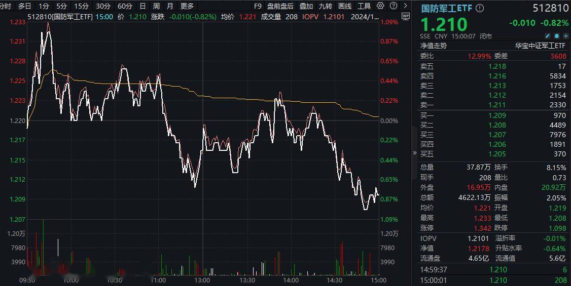 反映国防军工板块整体表现的国防军工ETF(512810)早盘红盘震荡,最高涨逾1%,午前及尾盘两度跳水,最终场内收跌0.82%,全天振幅超2%,缩量成交4622万元。