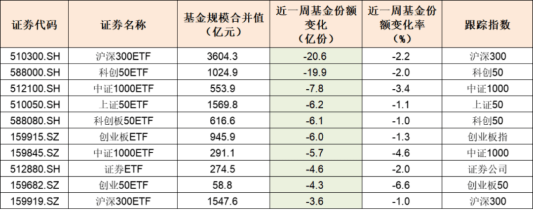 此外,中证1000、中证500、科创50等相关ETF在近一周和近一个月均有不少资金出逃。