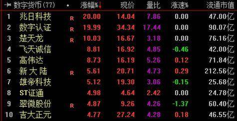 涨幅最大的前5个股为:兆日科技、数字认证20%;楚天龙涨10%;飞天诚信、高伟达涨超8%。