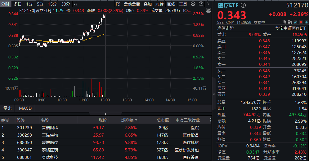 热门ETF方面,医疗ETF(512170)午前发力拉升,截至发稿场内价格涨2.39%,半日成交额超4亿元。