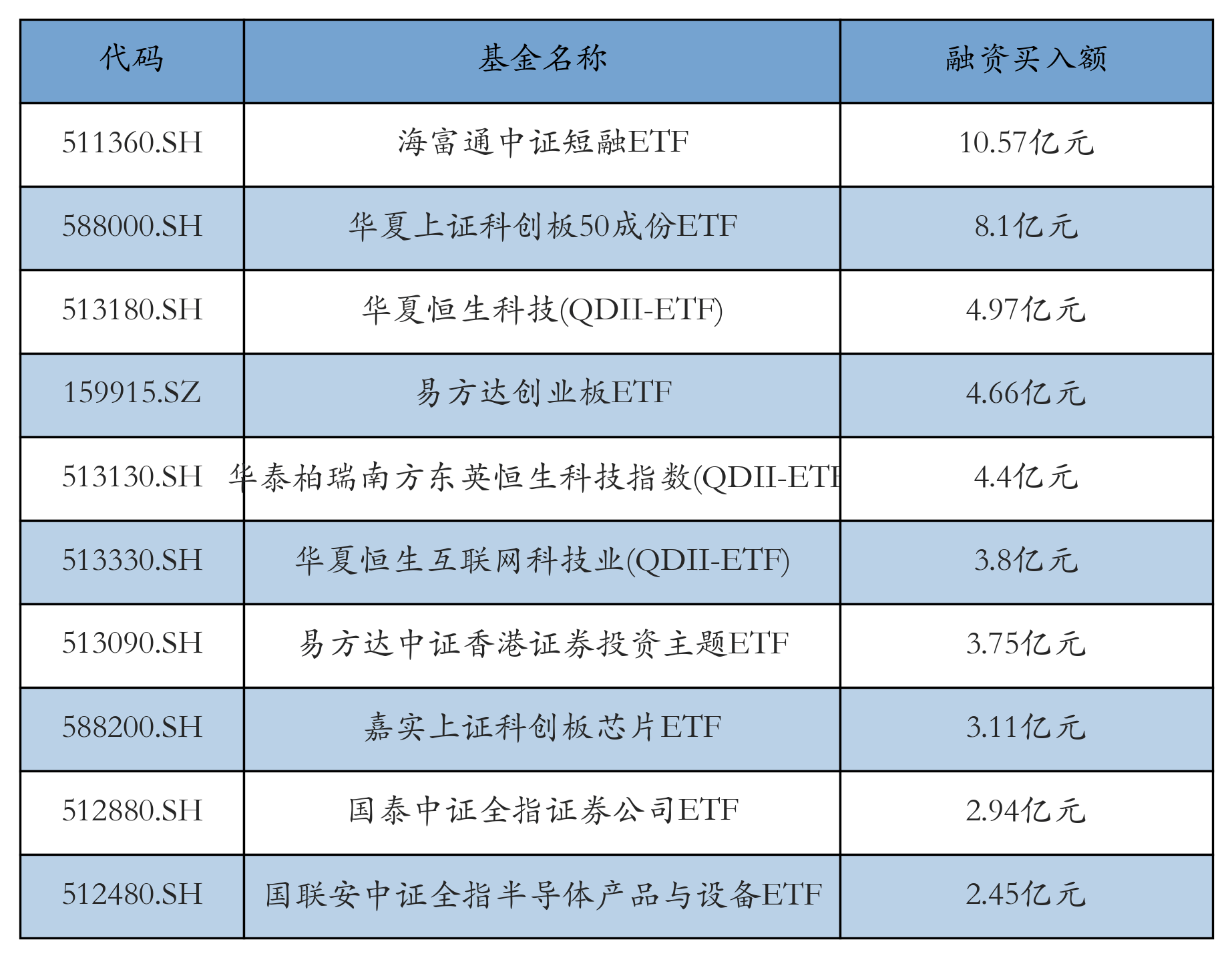 11月28日ETF融资买入额前三位分别为:海富通中证短融ETF(10.57亿元)、华夏上证科创板50成份ETF(8.1亿元)和华夏恒生科技(QDII-ETF)(4.97亿元),前10具体见下表: