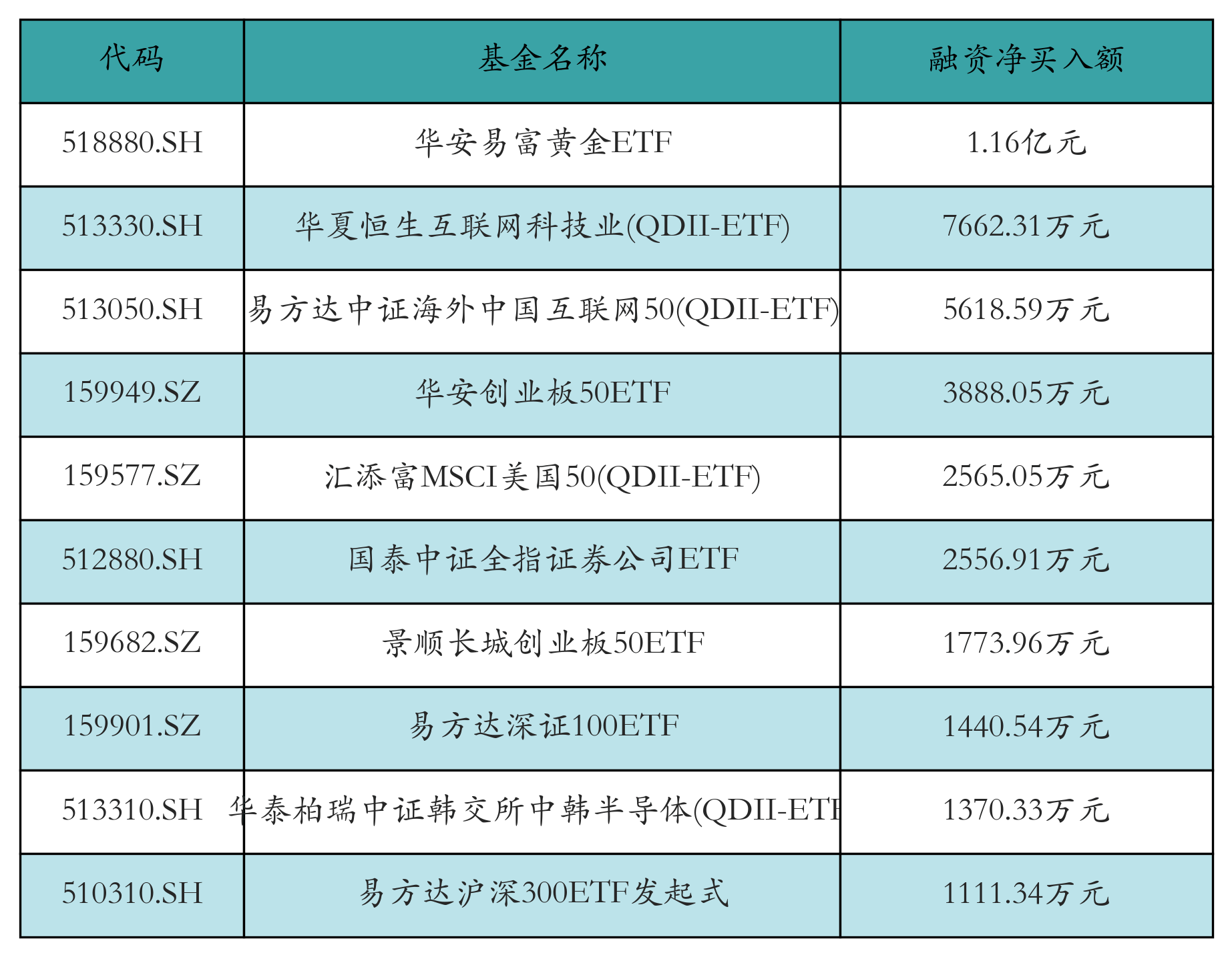 11月28日ETF融资净买入额前三位分别为:华安易富黄金ETF(1.16亿元)、华夏恒生互联网科技业(QDII-ETF)(7662.31万元)和易方达中证海外中国互联网50(QDII-ETF)(5618.59万元),前10具体见下表: