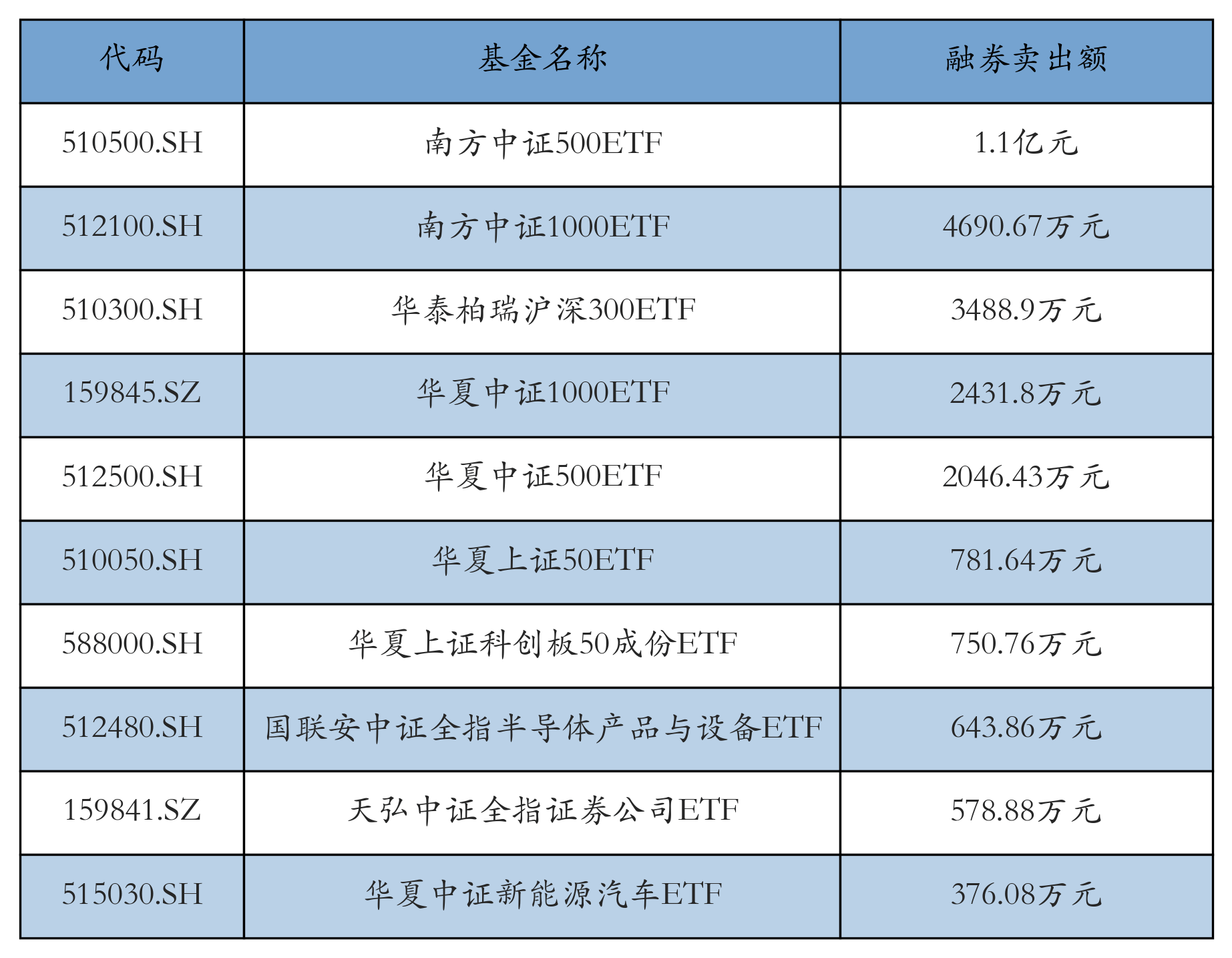 11月28日ETF融券卖出额前三位分别为:南方中证500ETF(1.1亿元)、南方中证1000ETF(4690.67万元)和华泰柏瑞沪深300ETF(3488.9万元),前10具体见下表: