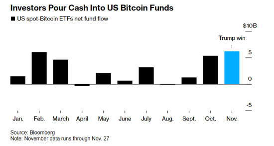 因特朗普对加密货币的支持,比特币这一数字货币历史性地到达99588美元/枚,12只美国现货比特币ETF即将迎来创纪录的月度净流入。