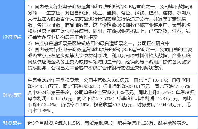 证券之星消息,生 意 宝11月29日涨停收盘,收盘价29.23元。该股于9点36分涨停,9次打开涨停,截止收盘封单资金为9730.94万元,占其流通市值1.32%。