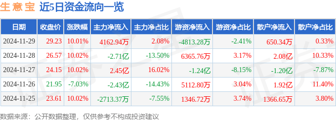11月29日的资金流向数据方面,主力资金净流入4162.94万元,占总成交额2.08%,游资资金净流出4813.28万元,占总成交额2.41%,散户资金净流入650.34万元,占总成交额0.33%。