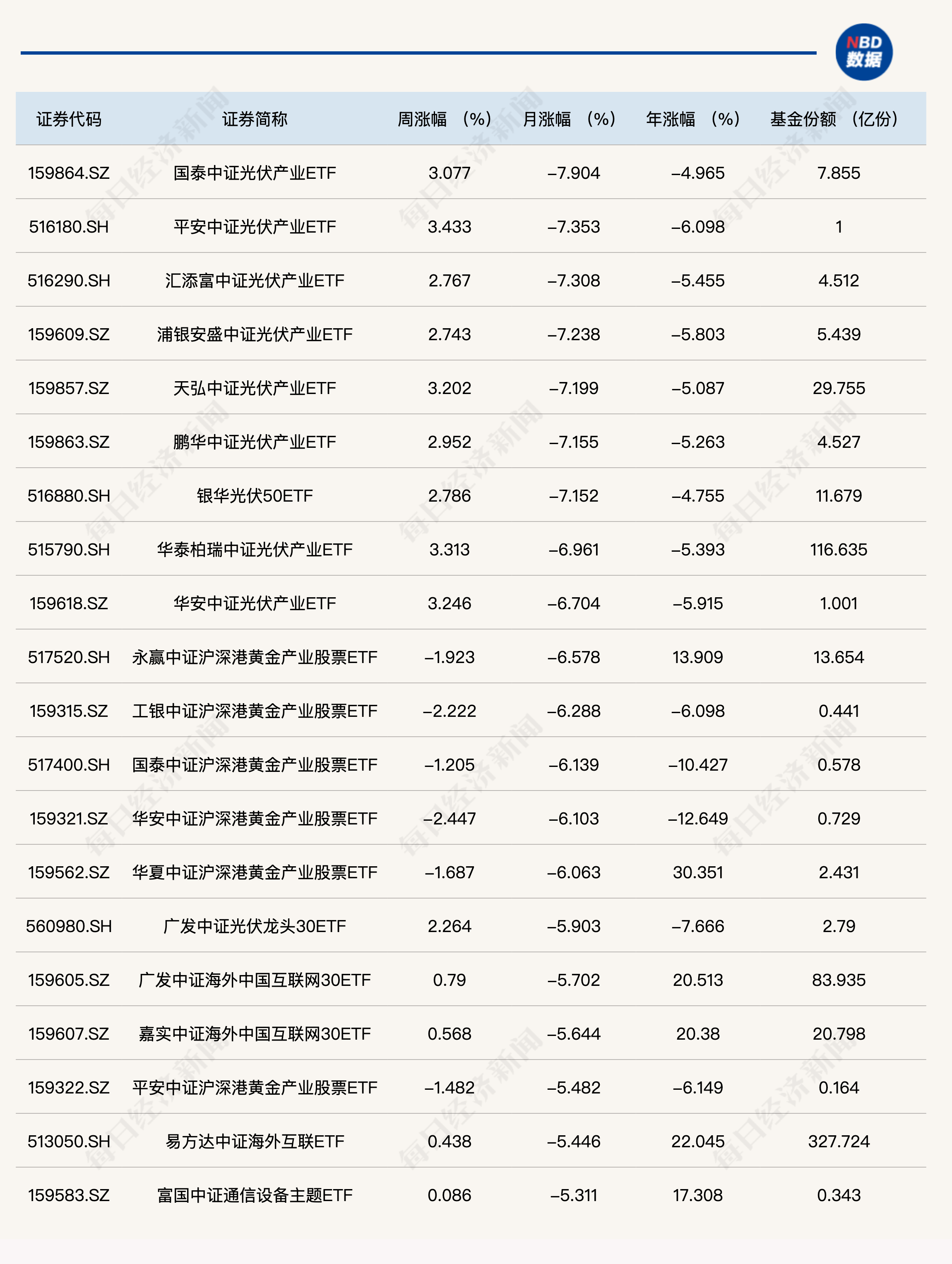 再看本月ETF的跌幅榜,本月表现欠佳的ETF集中在光伏ETF,黄金股ETF两大主题。