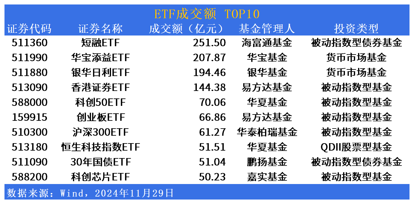 成交额方面,短融ETF(511360)成交额达251.50亿元,华宝添益ETF(511990)、银华日利ETF(511880)成交额紧随其后。香港证券ETF(513090)成交额居股票型ETF首位,达144.38亿元。