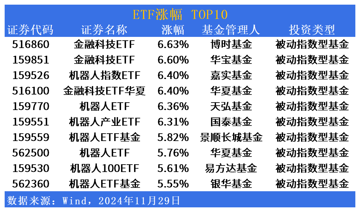 具体来看,金融科技ETF(516860)、金融科技ETF(159851)、金融科技ETF华夏(516100)涨超6%;机器人指数ETF(159526)、机器人ETF(159770)、机器人产业ETF(159551)、机器人ETF基金(159599)、机器人ETF(562500)、机器人100ETF(159530)、机器人ETF基金(562360)跟踪。