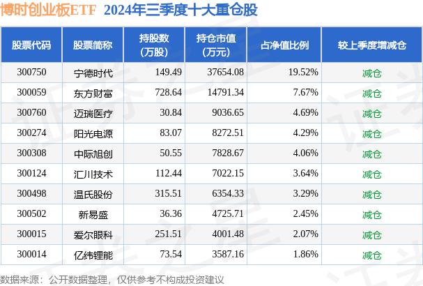 博时创业板ETF为指数型-股票基金,根据最新一期基金季报显示,该基金资产配置:股票占净值比99.13%,无债券类资产,现金占净值比0.93%。基金十大重仓股如下: