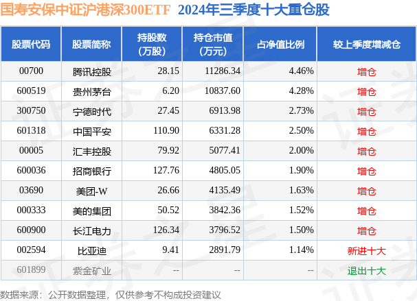 国寿安保中证沪港深300ETF为指数型-股票基金,根据最新一期基金季报显示,该基金资产配置:股票占净值比98.88%,无债券类资产,现金占净值比1.24%。基金十大重仓股如下: