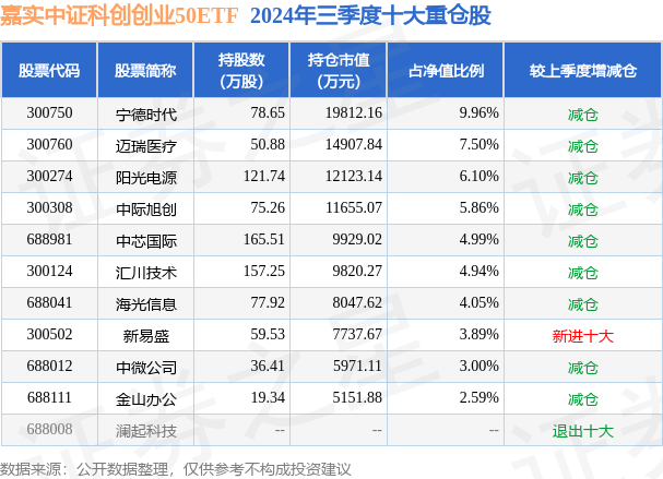 嘉实中证科创创业50ETF为指数型-股票基金,根据最新一期基金季报显示,该基金资产配置:股票占净值比99.6%,无债券类资产,现金占净值比0.52%。基金十大重仓股如下:
