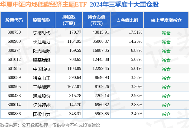 华夏中证内地低碳经济主题ETF为指数型-股票基金,根据最新一期基金季报显示,该基金资产配置:股票占净值比99.74%,无债券类资产,现金占净值比0.17%。基金十大重仓股如下: