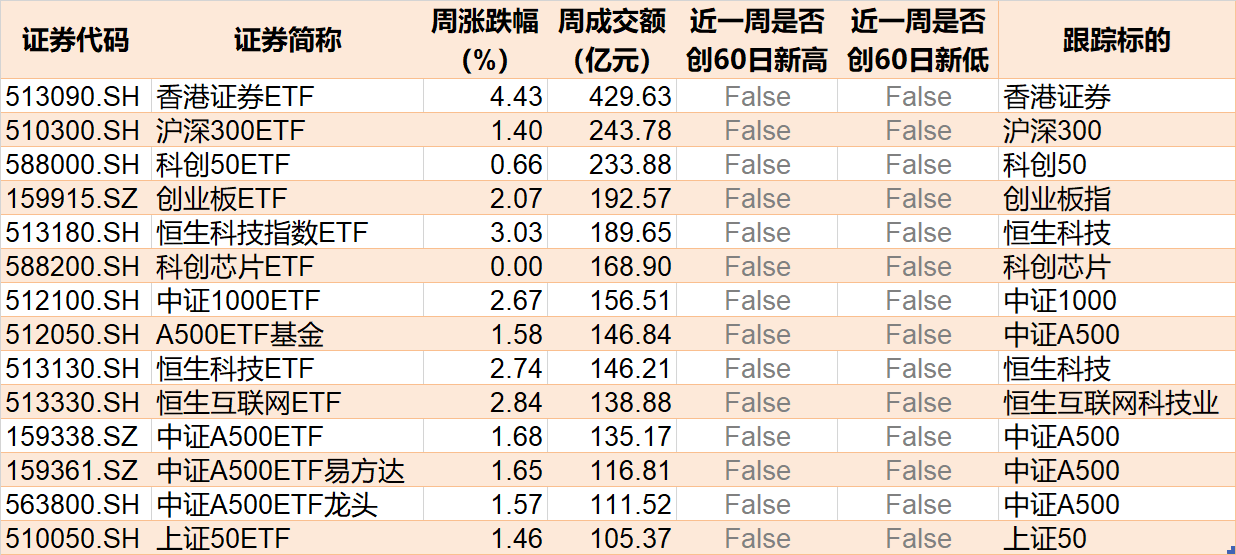 从单个ETF来看,香港证券ETF周成交额超400亿元,沪深300ETF、科创50ETF周成交额超200亿元。