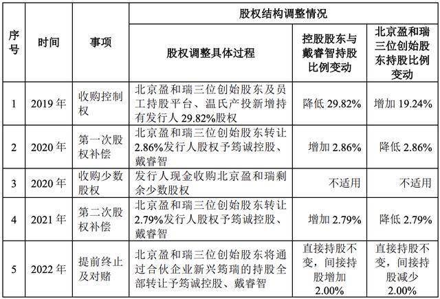 其中,北京盈和瑞三位创始股东于2020年将其持有的合计2.86%发行人股权转让予筠诚控股、戴睿智,于2021年将2.79%发行人股权转让予筠诚控股、戴睿智。2022年3月,对赌各方提前终止并解除了与收购北京盈和瑞相关的对赌条款,进行了最后股权调整。