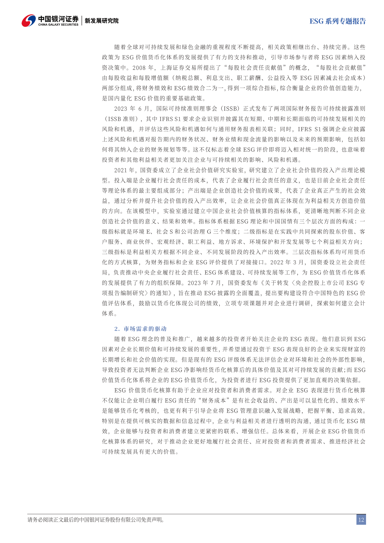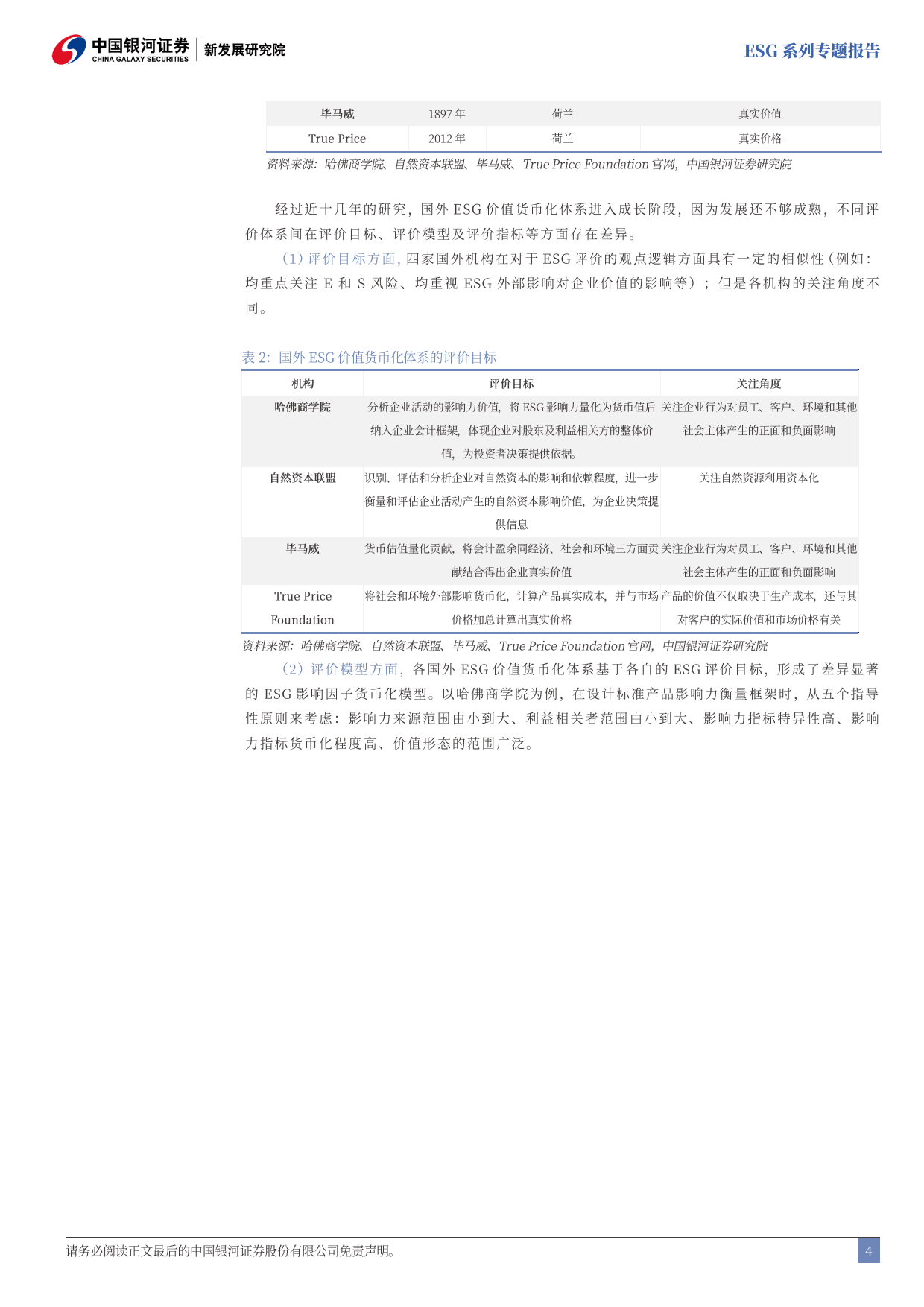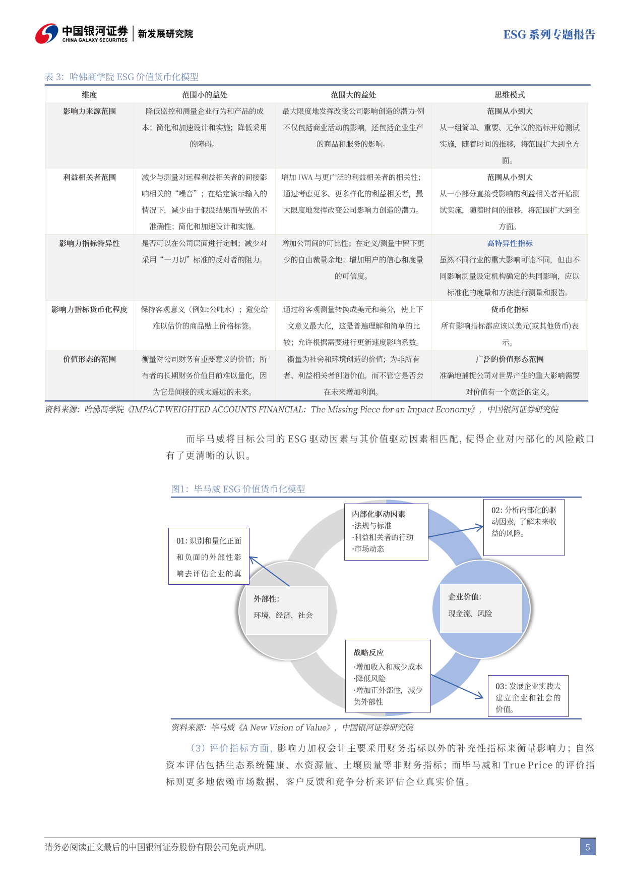为什么要建立ESG价值货币化体系?当前,ESG主要有网套评价体系,一售是ESG价值货币化核算体系,另一套是ESG评级体系。ESG评级体系是对企业的环境、社会和公司治理三个方面进行打分评级,在全球范围内被广泛采用。但由于ESG评级体系很难直观反映企业对环境、社会的外部性影响大小,也很难判断企业促进社会可持续发展的绩效。为此,国内外机构和学者重新重视将ESG因素量化以纳入财务评估,来衡量企业对可持续发展的具体贯献,ESG价值货币化核算体系再次引起关注。货币化测量企业社会绩效,可以帮助投资者理解和评估ESG因素对企业财务效的影响,有利于政府和监管部门出台激励相客的考核机制,为ESG价值与传统估值体系的融合提供了便利。