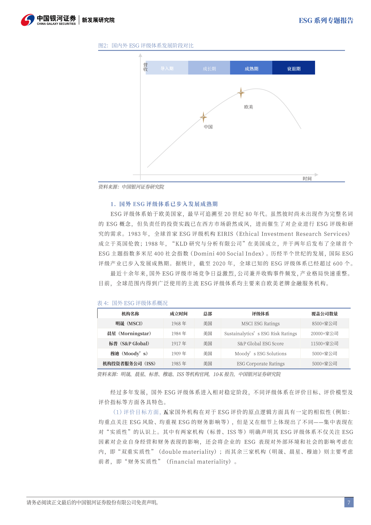 两套ESG评价体系表现特点和应用场盘差异:ESG价值货币化体系呈现如下特征:一是处于成长期,不含主观评价因素,更可能形成统一标准;二是可形成ESG价值核算报表,与财务报表整合,实现企业间可比性;三是为政府出台可持续金融政策提供数据支撑,激励企业规范ESG信息披露;四是与企业估值模型量纲一致,更易纳入其中,预测未来估值变化的趋势;五是支持投资者判断企业投资价值。相对而言,ESG评级体系现如下特征:一是发展成熟,覆盖企业范围广,市场认可度高;二是评价维度、议题和指标丰富,包含不能量化的指标;三是理论上对企业长期可持续发展与股票价格有一定预测作用;四是评级方法、标准存在较大差异,评级结果一致性差;五是评级结果不能直双展现对环境、社会的外部性影响大小。