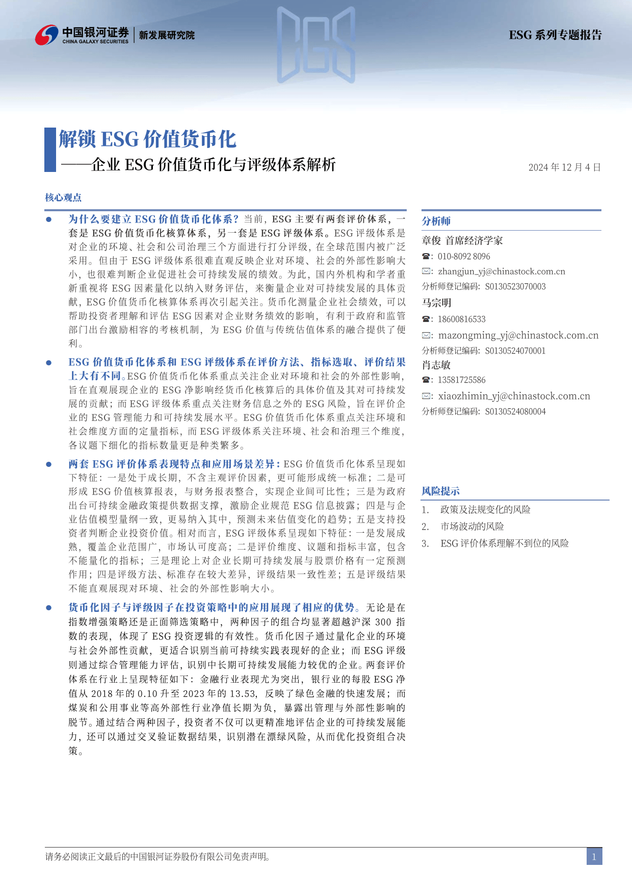 货币化因子与评级因子在投资策略中的应用展现了相应的优势。无论是在指数增强策略还是正面筛选策略中,两种因子的组合均显著超越沪深300指数的表现,体现了ESG投资逻辑的有效性。货币化因子通过量化企业的环境与社会外部性贡献,更适合识别当前可持续实践表现好的企业;面ESG评级则通过综合管理能力评估,识别中长期可特续发展能力较优的企业。两套评价体系在行业上呈现特征如下:金融行业表现尤为突出,银行业的每股ESG净值从2018年的0,10升至2023年的13.53.反映了绿色金融的快迷发展;而煤炭和公用事业等高外部性行业净值长期为负,暴露出管理与外部性影响的脱节。通过结合两种因子,投资者不仅可以更精准地评估企业的可持续发展能力,还可以通过交叉验证数据结果,识别潜在漂绿风险,从而优化投资组合决罐。
