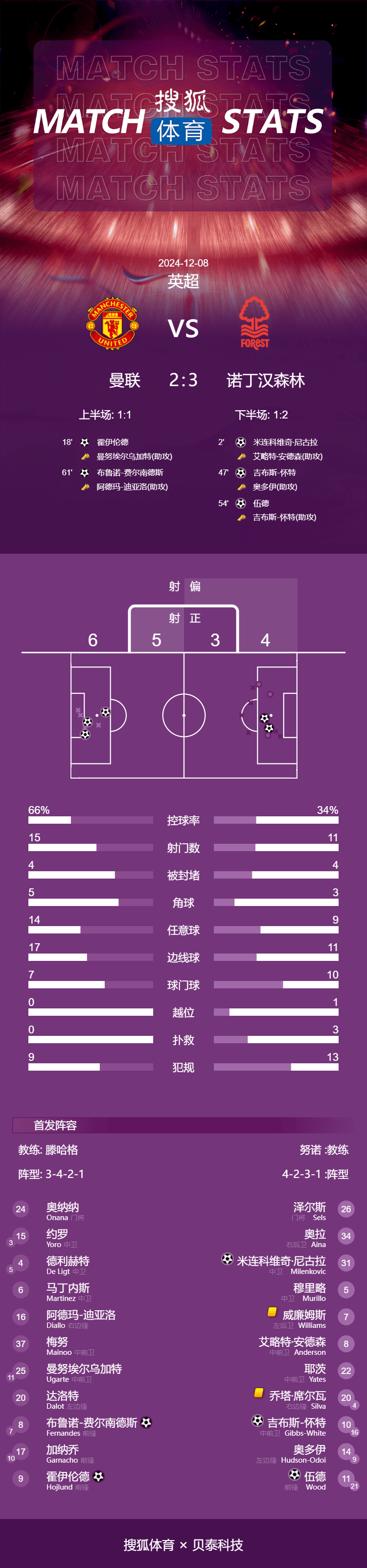 全场比赛战罢,曼联主场2-3不敌诺丁汉森林,遭遇联赛两连败。