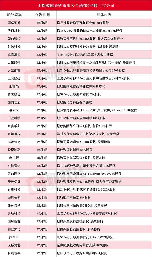 据财联社不完全统计,截至发稿, 本周披露并购重组进展的A股上市公司共有30家,分别是 国信证券、陕西煤业、领益智造、汇顶科技、金隅集团、云维股份、天富能源、玉龙股份、湘油泵、博杰股份、国网信通、凌云光、万安科技、宜宾纸业、富煌钢构、高凌信息、羚锐制药、永安行、中航泰达、天益医疗、安恒信息、正帆科技、国科恒泰、邦彦技术、索辰科技、国风新材、创业黑马、罗牛山、光威复材和科创新源,具体情况如下图: