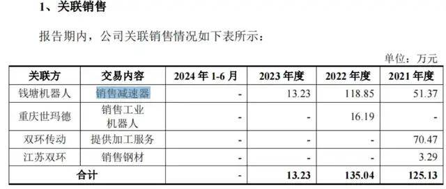 销售方面,环动科技还给双环传动、江苏双环、重庆世玛德、钱塘机器人提供加工服务、销售减速器、工业机器人等,2021年-2023年金额合计达125.13万元、135.04万元和13.23万元。