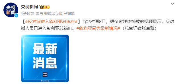当地时间8日,据多家媒体播放的视频显示,反对派人员已进入叙利亚总统府。(总台记者张卓雅)