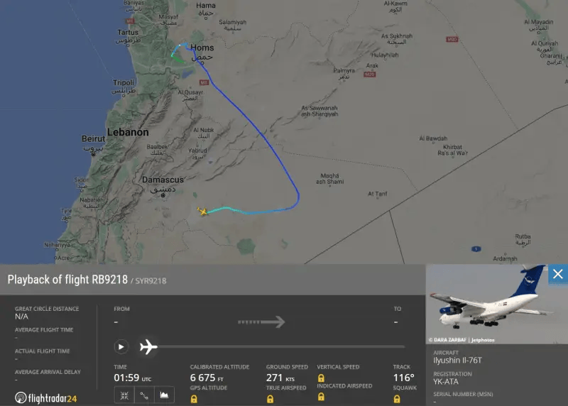 根据“飞行雷达”网站数据,在叙利亚反政府武装攻入大马士革消息传出后,叙利亚航空公司的一架型号为“伊尔-76”的飞机(呼号SYR9218)从大马士革机场起飞。飞机起初飞往叙利亚沿海地区,那里是阿萨德所属阿拉维派的据点,但随后突然掉头,朝相反方向飞行几分钟后,从地图上消失。