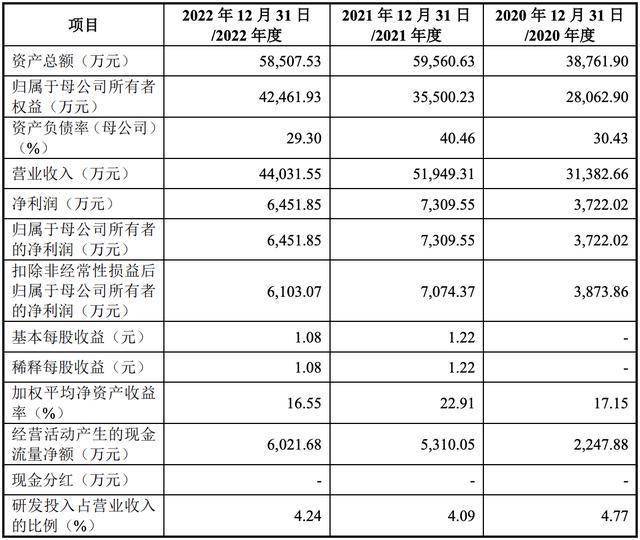 2020年、2021年和2022年,科峰股份的营收分别为3.14亿元、5.19亿元和4.40亿元,净利润分别为3722.02万元、7309.55万元和6451.85万元,扣非后净利润分别为3873.86万元、7074.37万元和6103.07万元。