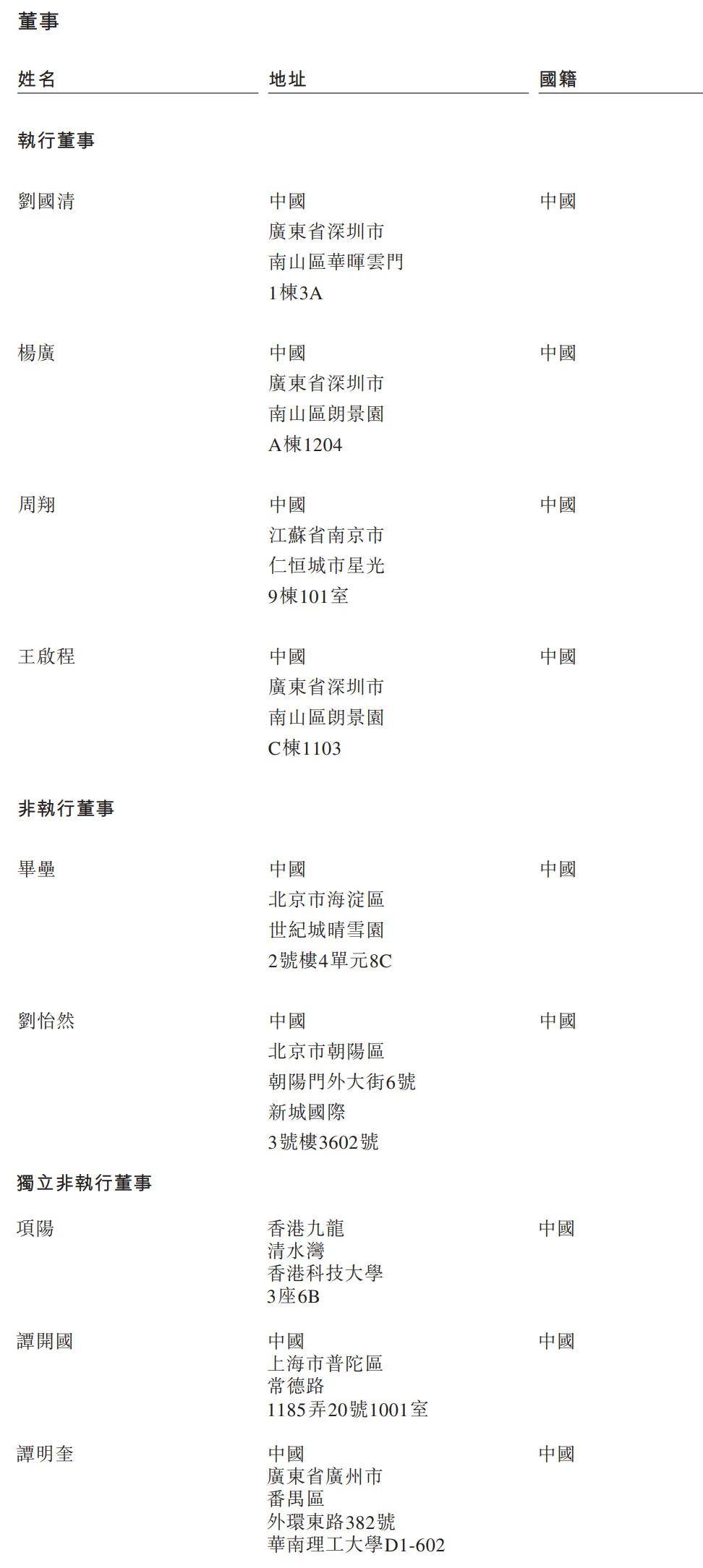佑驾创新执行董事分别为刘国清、杨广、周翔、王启程;非执行董事分别为毕垒、刘怡然;独立非执行董事分别为项阳、谭开国、谭明奎。