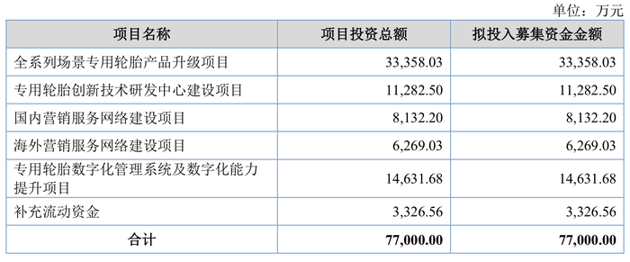 此番,泰凯英计划募7.7亿元,投入6个项目。其中“全系列场景专用轮胎产品升级项目”投入最大为3.34亿元,补流计划投入3326.56万元。