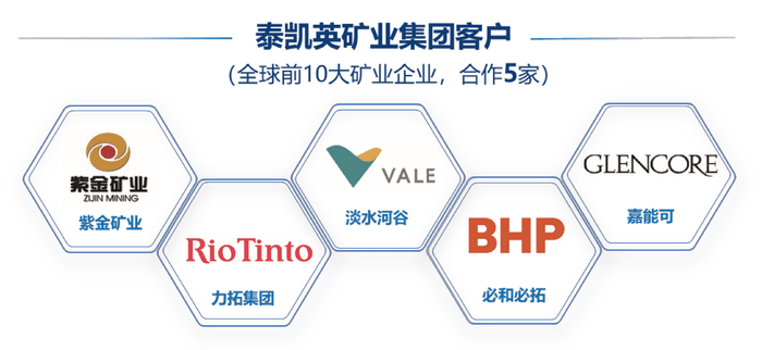 Mining.com网站发布的2023年全球矿业企业排行榜中,排名前10的企业有5家为公司客户,包括国内矿业巨头紫金矿业、全球矿业巨头力拓集团(RIO TINTO)、全球最大铁矿公司淡水河谷(VALE)、全球矿业和大宗商品交易巨头嘉能可(GLENCORE)、全球最大矿业公司必和必拓(BHP)等跨国公司。