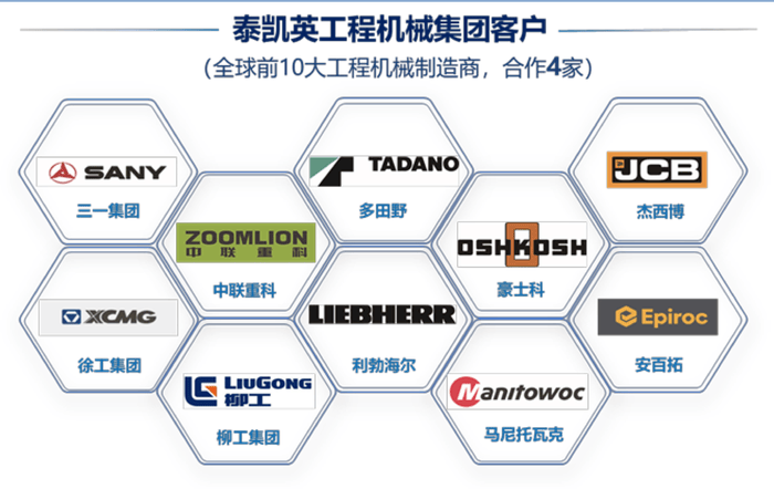 根据英国KHL集团旗下《国际建设》杂志(International Construction)发布的2024年度全球工程机械制造商排行榜,排名前10的企业中有4家为泰凯英客户,包括国内工程机械龙头三一集团、徐工集团,世界工程机械领先制造商利勃海尔(LIEBHERR)、杰西博(JCB)。