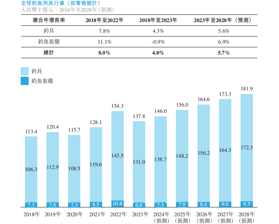 招股书显示,全球钓鱼用具行业(包括钓具和钓鱼装备)的市场规模于2018年至2022年以7.8%的复合年增长率由1134亿元增长至1543亿元,尽管2023年下降至1378亿元,但仍高于2021年水平。
