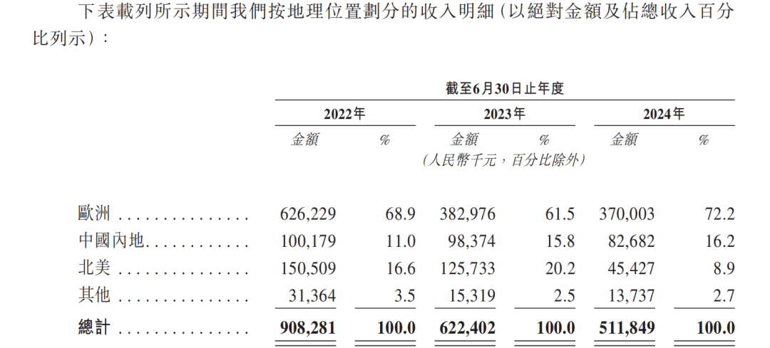 报告期内,乐欣户外于中国内地的销售分别占总收入的11.0%、15.8%、16.2%。与此同时,销售于欧洲的收入占比分别达到68.9%、61.5%、72.2%。