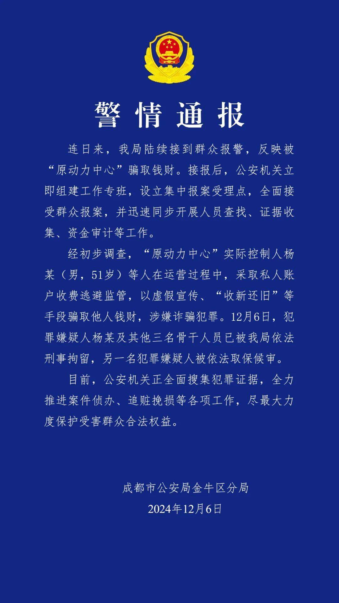 6日晚,四川成都市公安局金牛区分局发布警情通报: