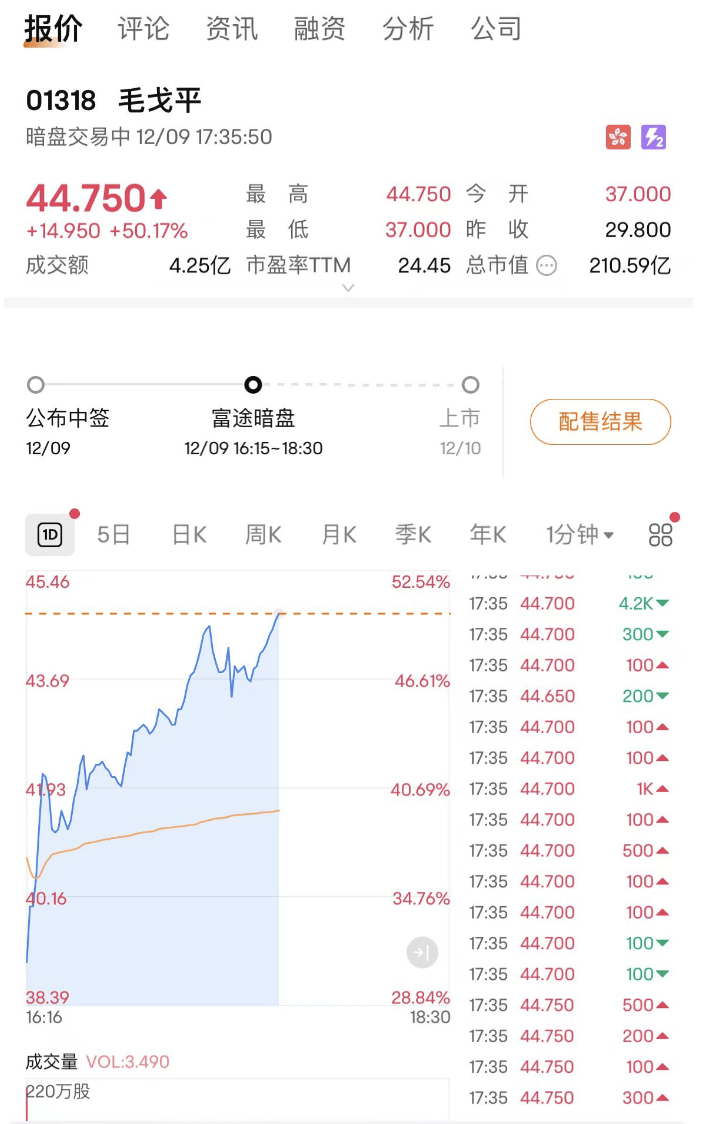 12月9日, 毛戈平(01318.HK)港股暗盘高开,涨超50%,报44.75港元/股。本次上市,毛戈平的公开发行价为26.3-29.8港元/股。