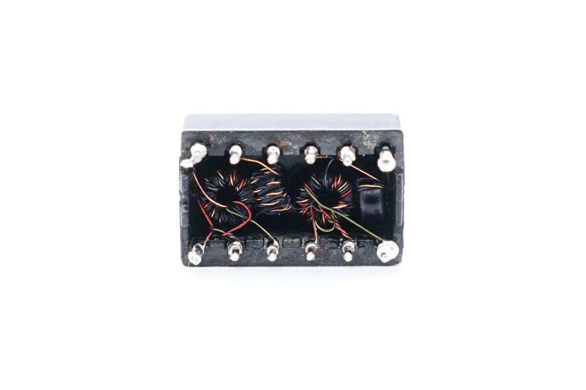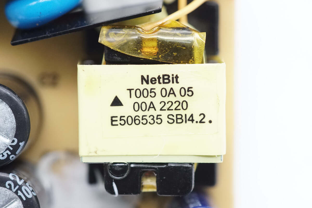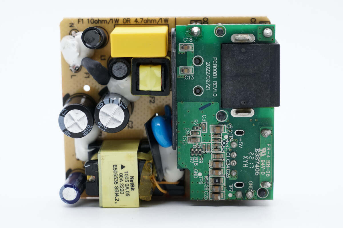 PCBA模块由两块小板组成,之间通过排针连接支撑,顶部小板对应网口模块处镂空降低厚度。主板正面工字电感、电容、变压器等器件打胶加固,此外设有麦拉片进行初次级隔离。