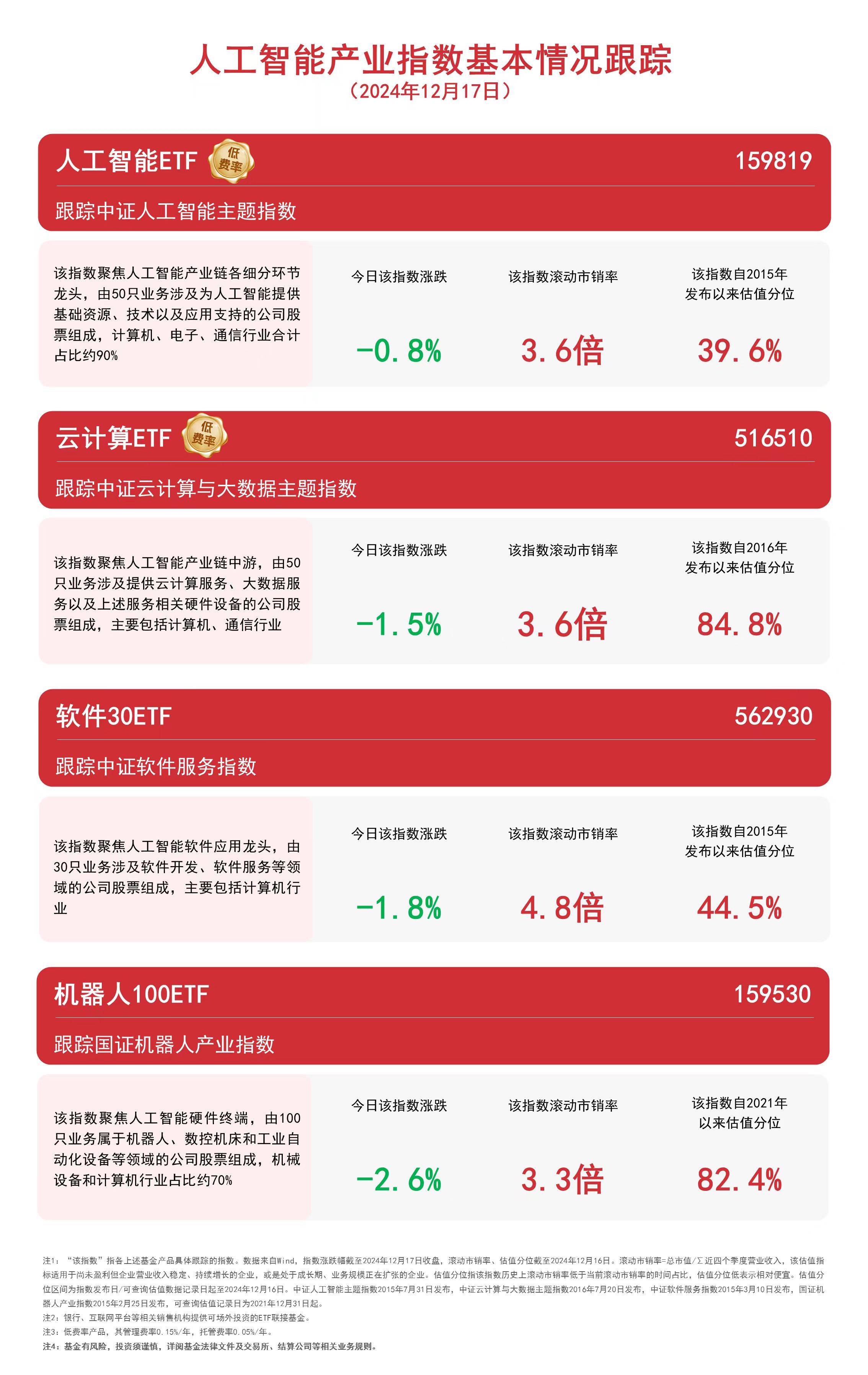 截至收盘,今日中证人工智能主题指数下跌0.8%,中证云计算与大数据主题指数下跌1.5%,中证软件服务指数下跌1.8%,国证机器人产业指数下跌2.6%。